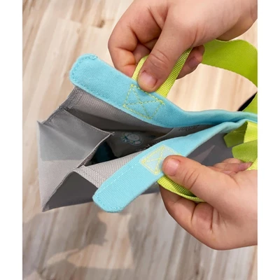 - All pieces fit easily into the handled bag, making this an excellent toy for on-the-go fun. Features soft, printed fabrics, bright accents and cute detailing. Machine washable on cold/delicate.