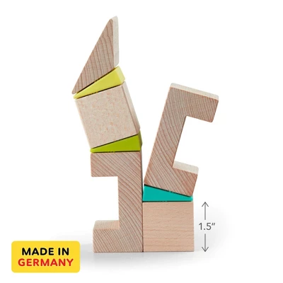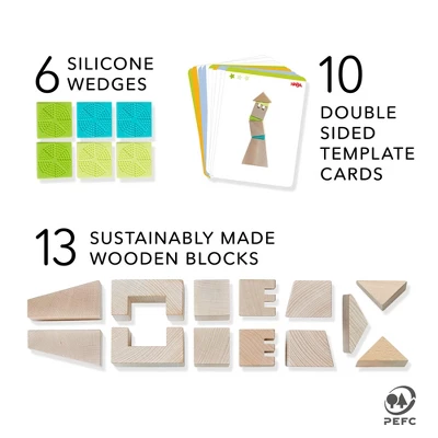 - Set includes: 13 building blocks, 6 silicone wedges, 10 template cards. Wooden pieces are crafted in Germany using sustainably sourced beech wood.