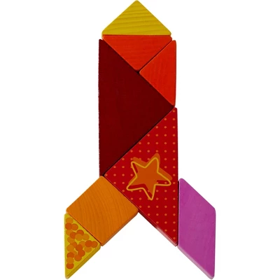 A few minutes ago, it was a dog; now it’s a swan! 21 wooden standard Tangram geometric shapes with funny faces and decorative imprints stimulate creative imaginations. Add 20 double sided,laminated, tear-proof cards with ideas ranging from one star to three star difficulty and this set becomes a launch pad for junior artists to experiment freely. Cleaning Instructions: HABA recommends using a cloth lightly dampened with warm water. If you wish to disinfect the toy with a cleaning agent, use a small amount of either water and a mild dish soap or a water & vinegar essence mix. Both options work extremely well in destroying bacteria and cleaning wooden toys. After cleaning, wipe the toy dry with a clean cloth. Remember, Wood is a natural material that soaks in moisture. Do not ever submerse wooden toys in water or place in a dishwasher. Disinfectants (even organic baby wipes), should not be used as they can damage the water based protective coatings applied to protect the stains or paints beneath.