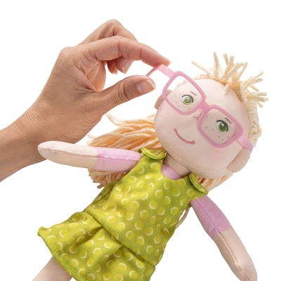 - Leonore stands 12″ tall and has a sweet embroidered face with green eyes and a sprinkling of freckles under her removable pink frames. Her blonde hair is tied back in a ponytail.